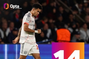 迪亚斯在欧冠比赛中打进14球,并列哥伦比亚球员最多