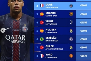足坛U20球员身价榜:亚马尔2亿欧居首,杜埃次席,库巴西第三
